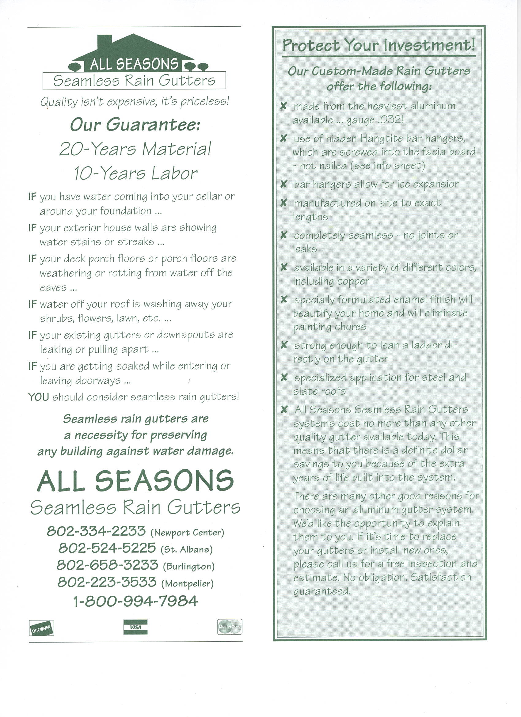 Experience exceptional gutter installation services with All Season’s Seamless Rain Gutters, your trusted experts in Northern Vermont. Our seamless gutter systems are crafted on-site, providing a perfect fit that reduces the risk of leaks and failures. With options like LeafProof®, HydroFlo™, and Shur-Flo™, your gutters will be armed against clogs and debris all year long. Our durable materials and expert craftsmanship mean you can count on us for efficient solutions tailored specifically to your home’s needs. Don't leave your property at risk, contact us today to schedule an installation and protect your investment.
